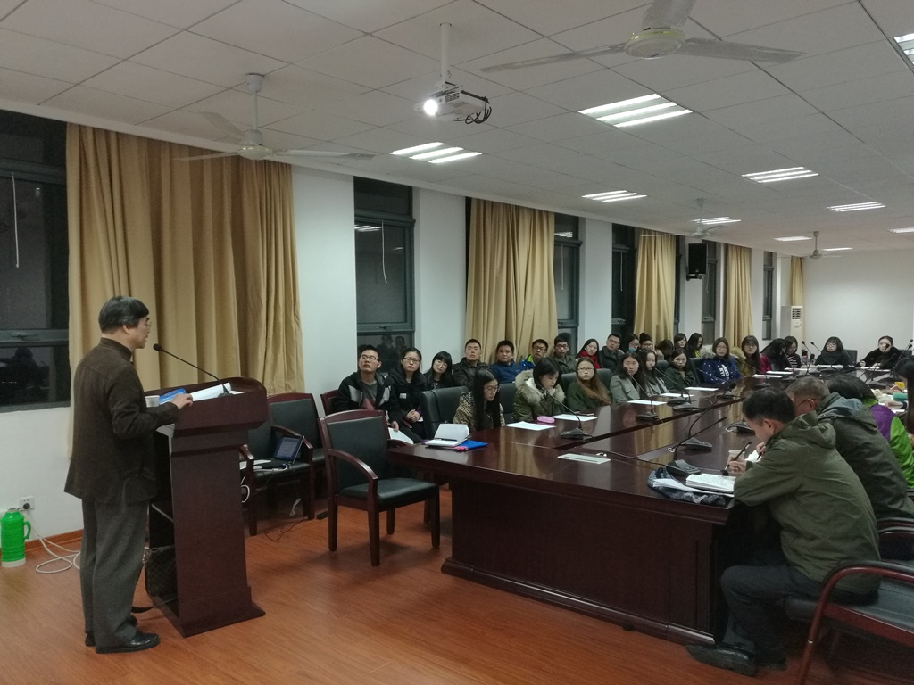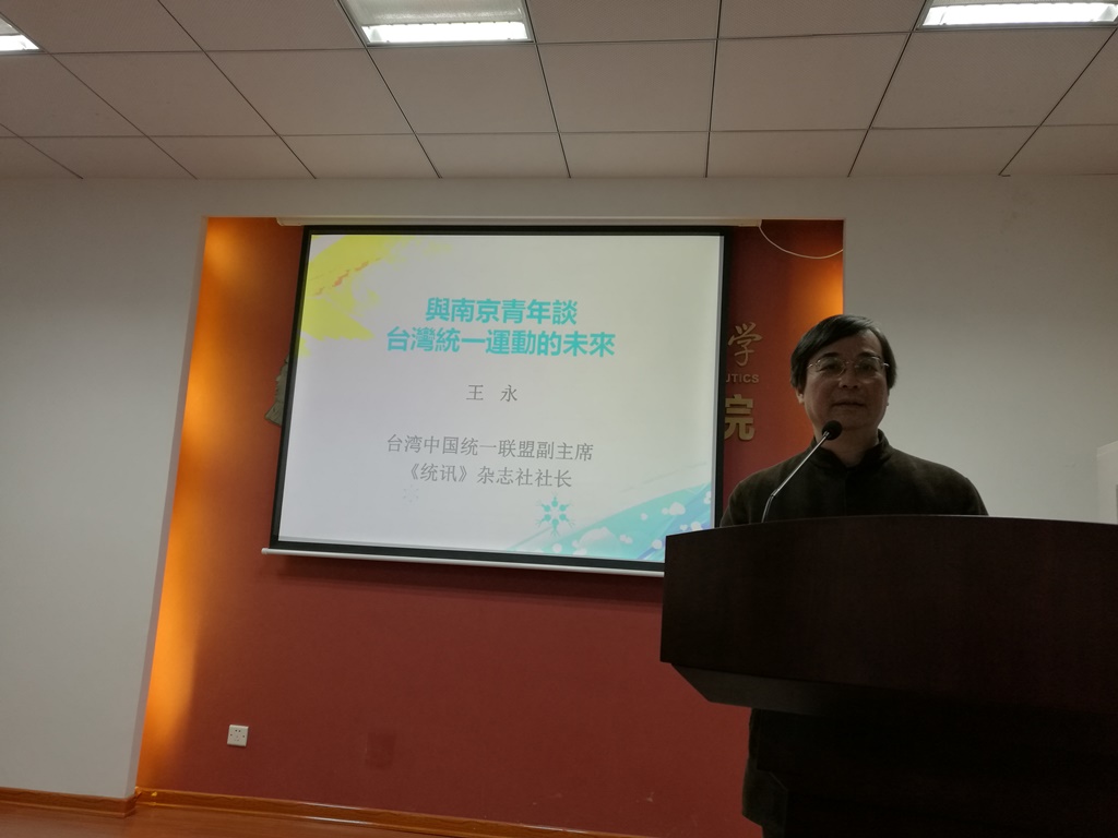 随后,王永主席以《与南京青年谈台湾统一的未来》为题发表了主题演讲。演讲会由副院长缪国龙主持。学院《毛概》、《马原》、《中近史》课程组的部分老师与本科生、研究生一起聆听王永主席的演讲。
