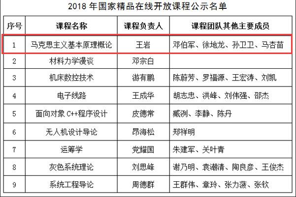 近日,教育部公示了2018年国家精品在线开放课程认定结果,我校组织申报的9门课程上榜,我院马克思主义基本原理概论入选。