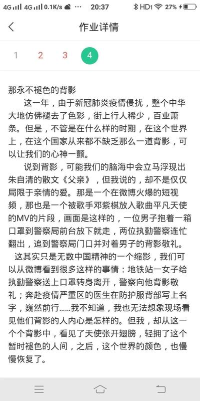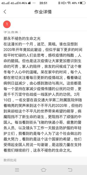 在快下课时,我布置了三道必选的作业,和一道可以免写的自选作业:用“那永不褪色的……”为标题,记录这些天宅在家的真情实感。原本以为不会有很多同学提交,没想到一个小时不到的时间,多篇作业提交,每一篇都写得十分真挚与感人。