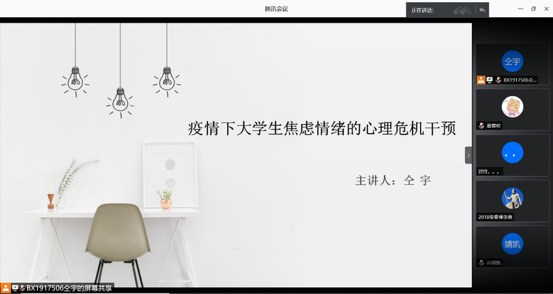 为调整学生疫情期间焦虑情绪,关注同学们心理健康,必威betway西汉姆研究生会于6月12日在腾讯会议平台举办互学充电站第一期“疫情下大学生焦虑情绪的心理危机干预”线上分享活动,马克思主义基本原理专业博士仝宇主讲。