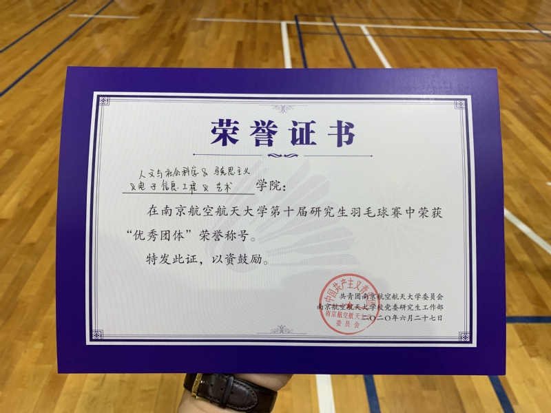 6月26日、27日,西汉姆联第十届研究生羽毛球赛在将军路校区东区体育馆举行。经过两天的角逐,我院与电子信息工程学院、人文与社会科学学院、艺术学院联合组成的参赛队伍成功进入8强,在比赛中荣获“优秀团队”称号。