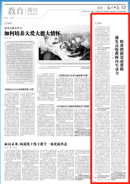 6月16日,《光明日报》刊发校党委常委、宣传部/教师工作部部长、我院硕士生导师王晖的文章《精准把握思政逻辑 激发高校教师内生动力》,现将全文刊发如下: