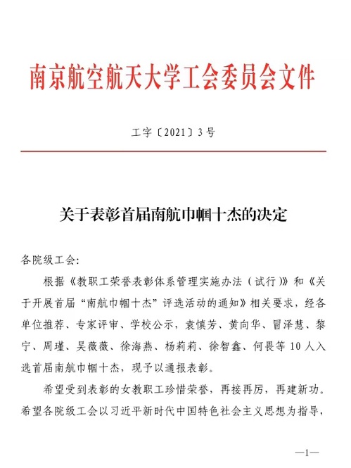 此外,根据《教职工荣誉表彰体系管理实施办法(试行)》和《关于开展首届“南航巾帼十杰”评选活动的通知》相关要求,经各单位推荐、专家评审、学校公示,何畏教授还入选了首届南航巾帼十杰。