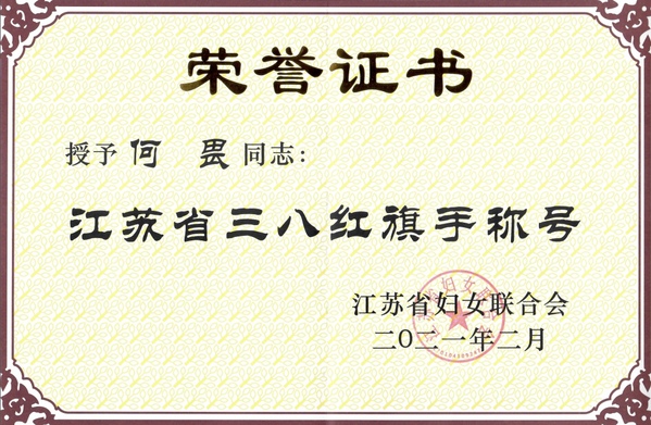 日前,江苏省妇联对2020年度江苏省三八红旗手标兵、三八红旗手、三八红旗集体进行了表彰,我院副院长何畏教授荣获江苏省“三八红旗手”称号。