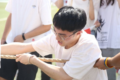 运动会的第一个项目是师生拔河友谊赛,我院派宋文璇同学为代表加入学生队,与老师队进行紧张而激烈的对抗。