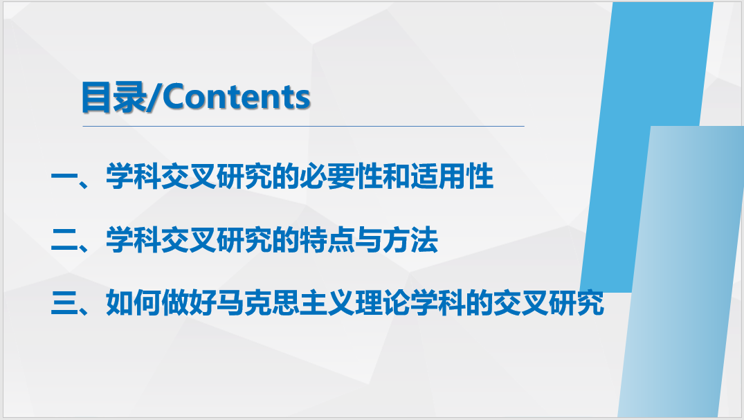 主讲人从学科交叉研究的必要性和适用性、特点与方法以及如何做好马克思主义理论学科的交叉研究这三个方面展开介绍。