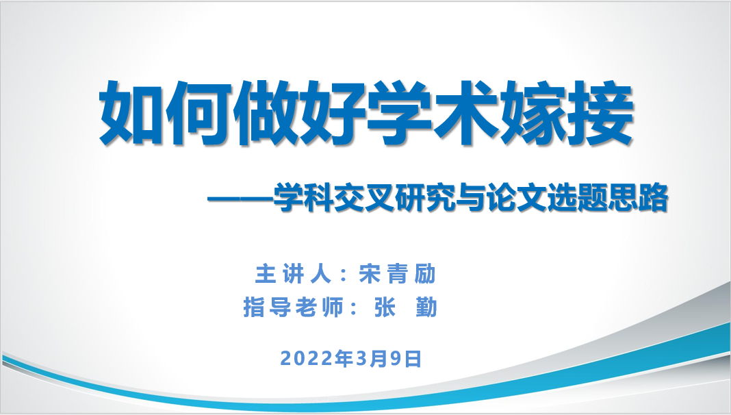 首先,主讲人简单介绍了什么是学科交叉研究,从拓宽知识边界、打破学科壁垒、培养复合型人才三个方面讲述了学科交叉研究的必要性。主讲人从国家课题基金项目申报、期刊论文发表这两个角度分析了学科交叉研究的适用性,并向同学们介绍了三位复合型学者的例子,通过自身真实经历表明学科交叉研究的可行性。