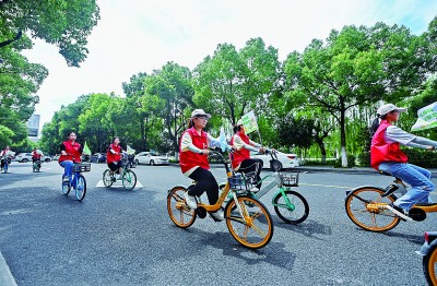 浙江湖州的青年志愿者骑自行车进行低碳日主题宣传,倡导绿色出行。新华社发