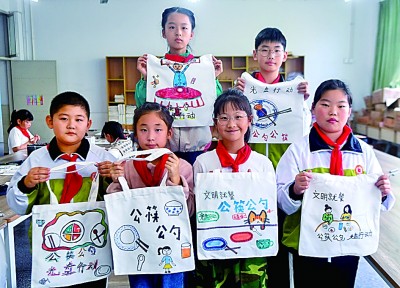 浙江嘉兴的小学生在展示自己创作的环保袋宣传画。新华社发