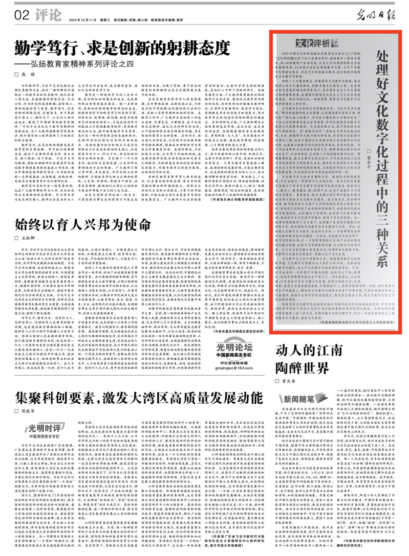 10月11日,《光明日报》第02版刊发了我院董金平副教授的文章《处理好文化数字化过程中的三种关系》,现将全文转发如下: