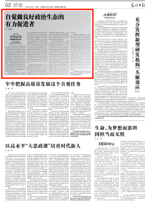 3月25日,《光明日报》第02版“光明论坛”栏目刊发了江苏省习近平新时代中国特色社会主义思想研究中心西汉姆联基地研究员王晓庆的理论文章《自觉做良好政治生态的有力促进者》,现将全文转发如下:
