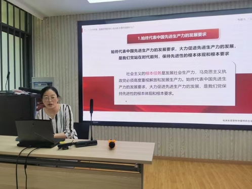 在第二届全省高校思想政治理论课教学展示活动中荣获“毛泽东思想和中国特色社会主义理论体系概论”(本科)课程江苏省一等奖的魏伟老师为大家进行了教学展示并分享了参赛经验。在教学展示环节,魏伟以“三个代表”重要思想为主题,综合案例教学、启发式教学等多种教学方法,图文并茂深入浅出地讲授了“三个代表”重要思想的形成、主要内容及历史地位。