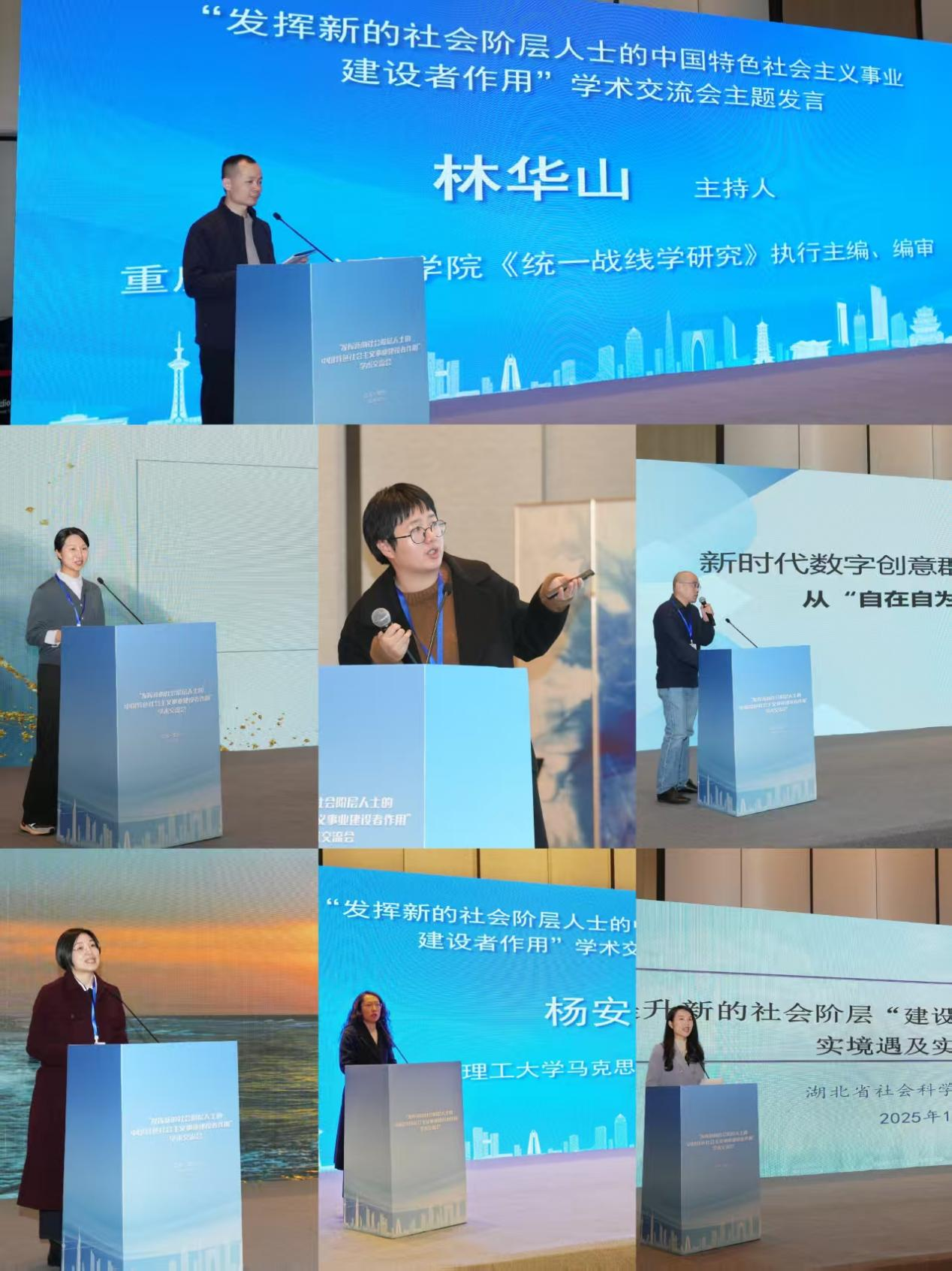 主题发言的第一个阶段由重庆社会主义学院《统一战线学研究》执行主编、编审林华山主持。江苏省社会科学院社会学研究所副研究员后梦婷,南京师范大学新闻与传播学院副教授、网络人士与新的社会阶层人士研究中心执行主任张伟伟,江苏省社会主义学院科研处四级调研员吉强,湖南省社会主义学院教授雷明贵,武汉理工大学必威betway西汉姆副教授杨安妮,湖北省社会科学院马克思主义研究所助理研究员李盛婷分别作主题为《新的社会阶层人士的概念生成、发展规律和未来趋势》《新时代新的社会阶层人士统战话语体系构建研究》《新时代数字创意群体建设力发挥研究》《链接“建设者”发挥“建设力”——基于湖南湘江新区“把新联会建在产业链上”案例的分析》《新的社会阶层人士协商式参与的路径优化与机制构建》《提升新的社会阶层“建设力”:理论渊源、现实境遇及实践路径》的报告。
